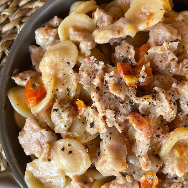 Nel frattempo metti a cuocere la pasta in una pentola con abbondante acqua salata in ebollizione e quando sarà al dente, scolala e falla saltare in padella con la salsiccia, aggiungi lo stracchino e fallo sciogliere bene. Amalgama per bene gli ingredinti fino a renderla cremosa.