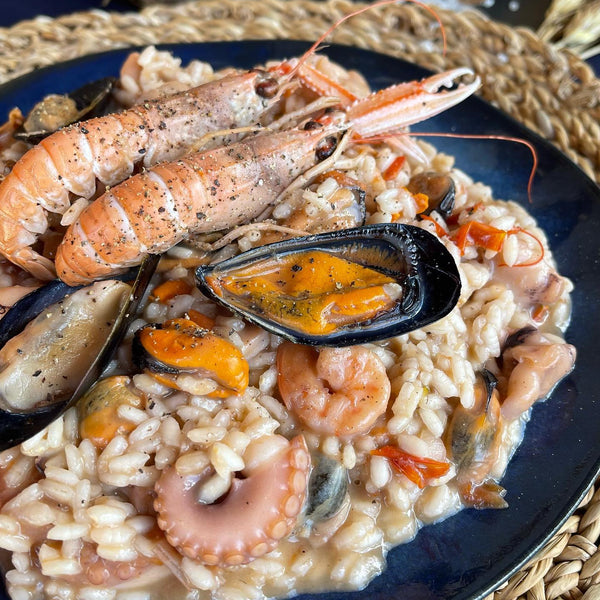 Aggiungete il liquido di cottura dei molluschi e il brodo non troppo salato, consiglio di aggiustare la sapidità alla fine. Aggiungete il brodo man mano che lo richiede. Quasi a fine cottura unite il burro, mantecate. Cucinate il riso per 15 minuti circa ed aggiungete il misto di mare con le cozze sgusciate. Impiattate il risotto e completate il piatto con le cozze, le che avete tenuto con il guscio, e sopra gli scampi. Ultimate con il prezzemolo tritato o del pepe e servite.