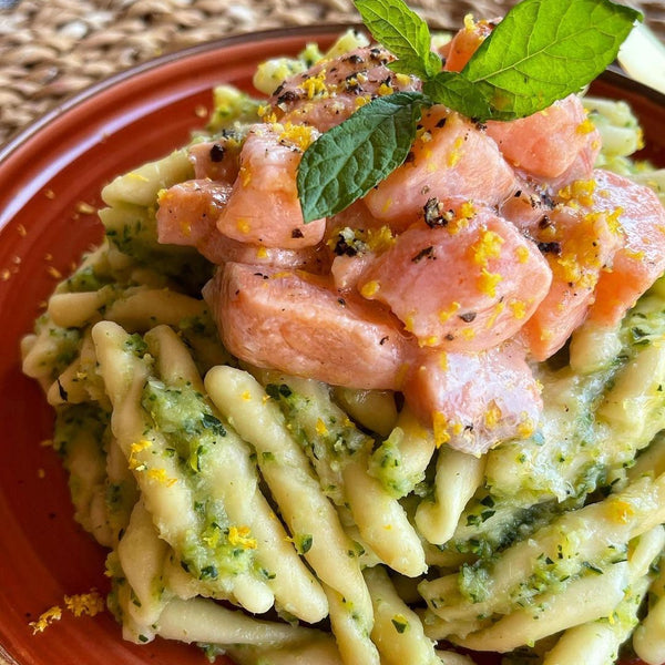 Trasferisci il salmone in una ciotola e condiscilo con un filo d’olio e un pizzico di sale e di pepe bianco; aggiungi il succo e la scorza grattugiata di limone o lime. Mescola bene e lascia marinare per 30 minuti, circa. Quando l’acqua per la pasta arriverà a bollore, salate e buttate le trofie. Quindi versate le zucchine in una ciotola dai bordi alti. Con un mixer frullate tutto e lasciate da parte la vostra crema . Una volta che le trofie saranno pronte, consiglio cottura al dente, fatele mantecare con la crema di zucchine in padella. È il momento d’impiattare, quindi creare un nido di trofie e mettetele all’interno del piatto, adagiare sopra la pasta la tartare di salmone, L’ultimo tocco con del pepe macinato, del limone grattugiato e una fogliolina di menta fresca. Ecco che il piatto è pronto ed è anche il momento di gustarlo.