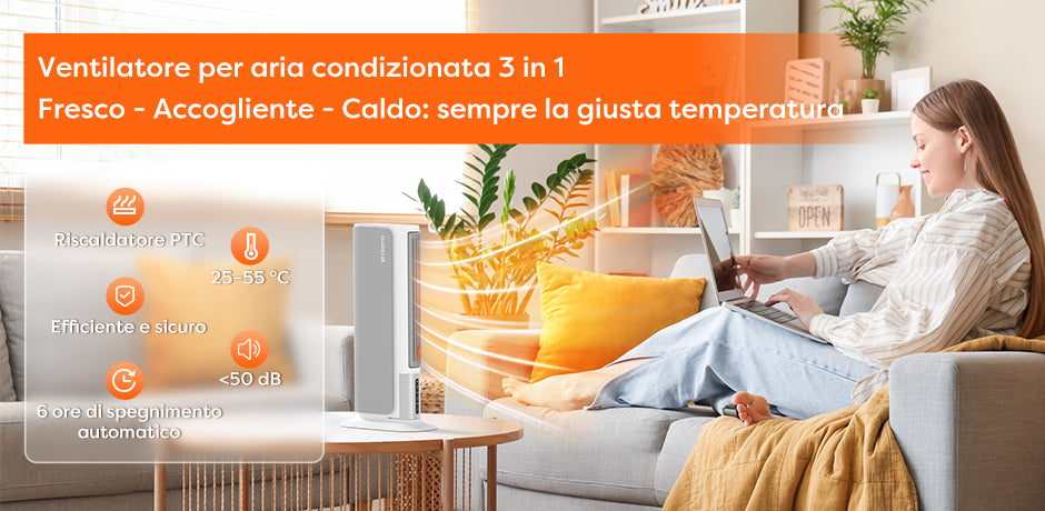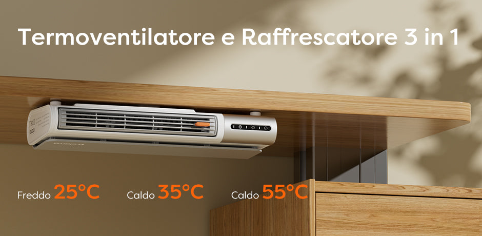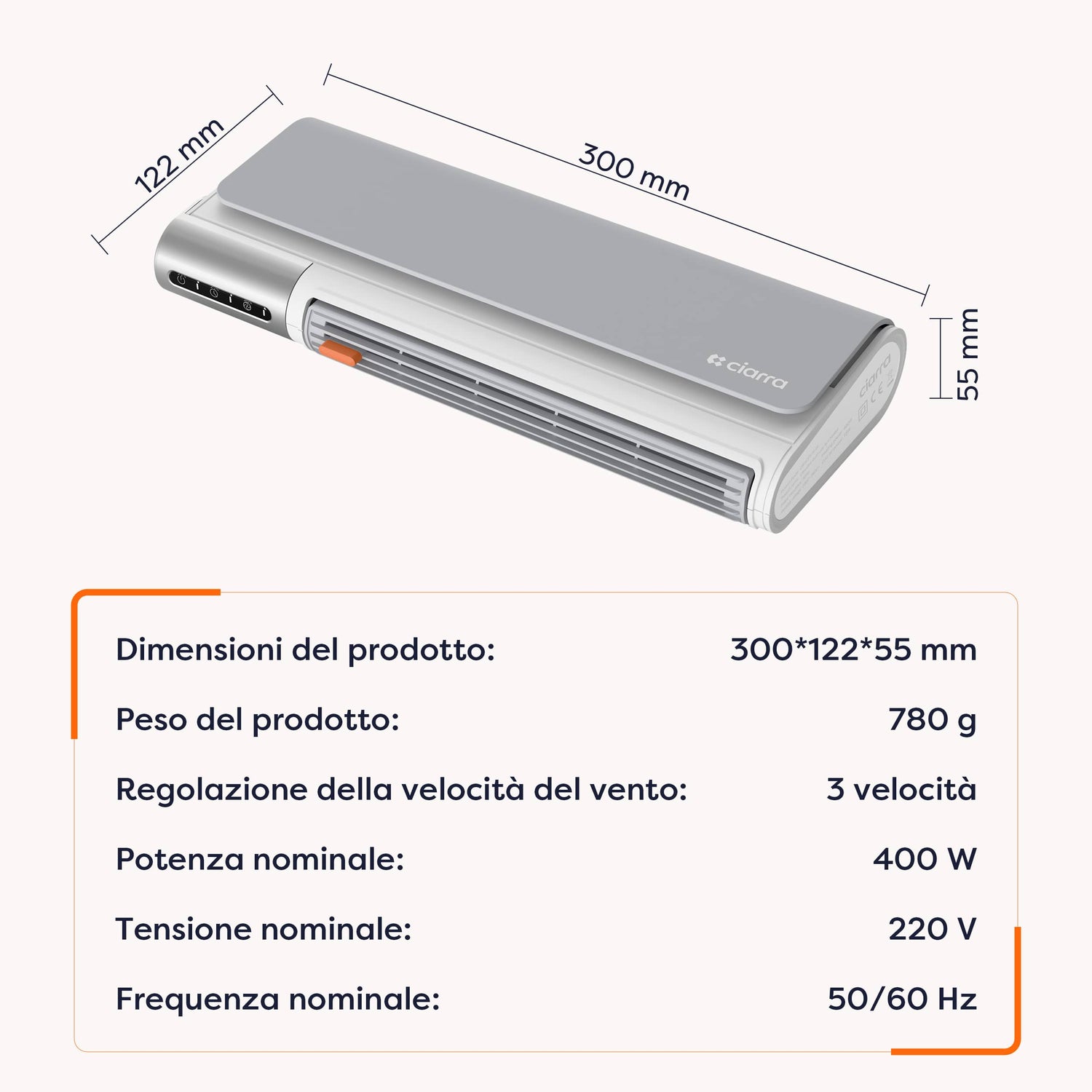 | Velocità della ventola | 3 livelli regolabili: Livello 1 (Modalità aria fredda): 15W Livello 2 (Riscaldamento basso): 370W Livello 3 (Riscaldamento alto): 400W |