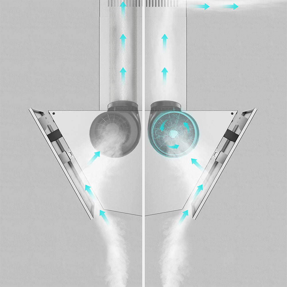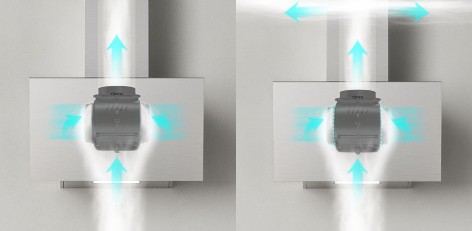 - Due Modalità di Funzionamento - Modalità riciclo (filtro a carbone) o estrazione esterna (installazione flessibile).