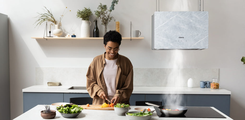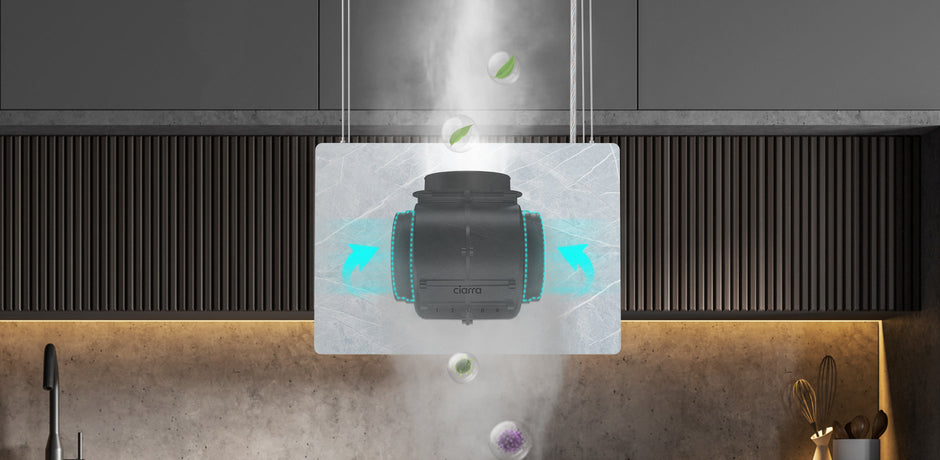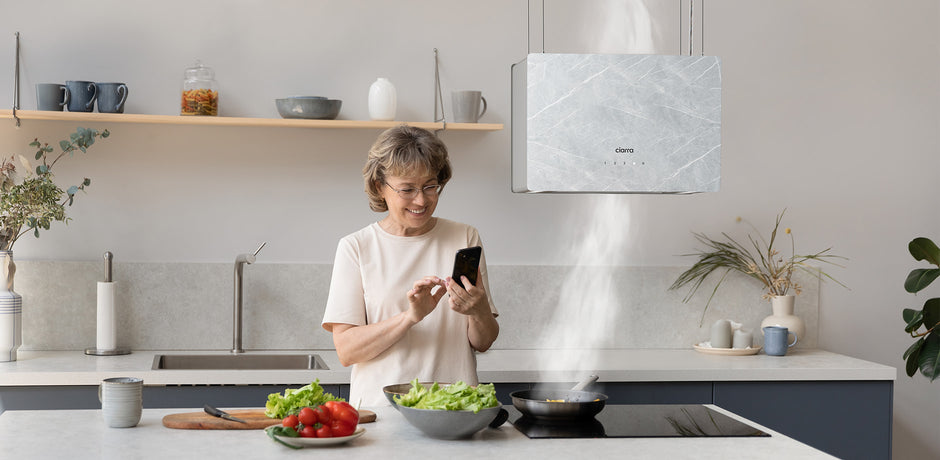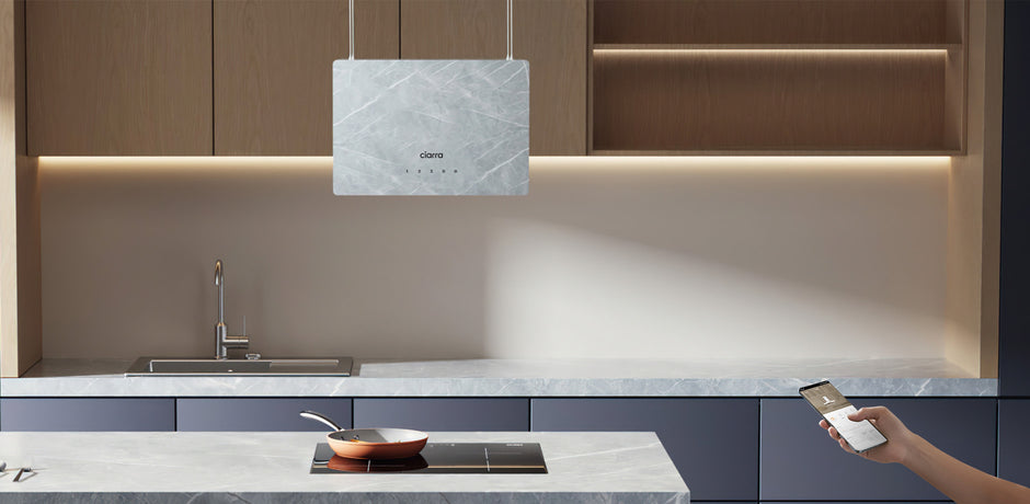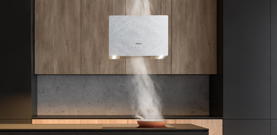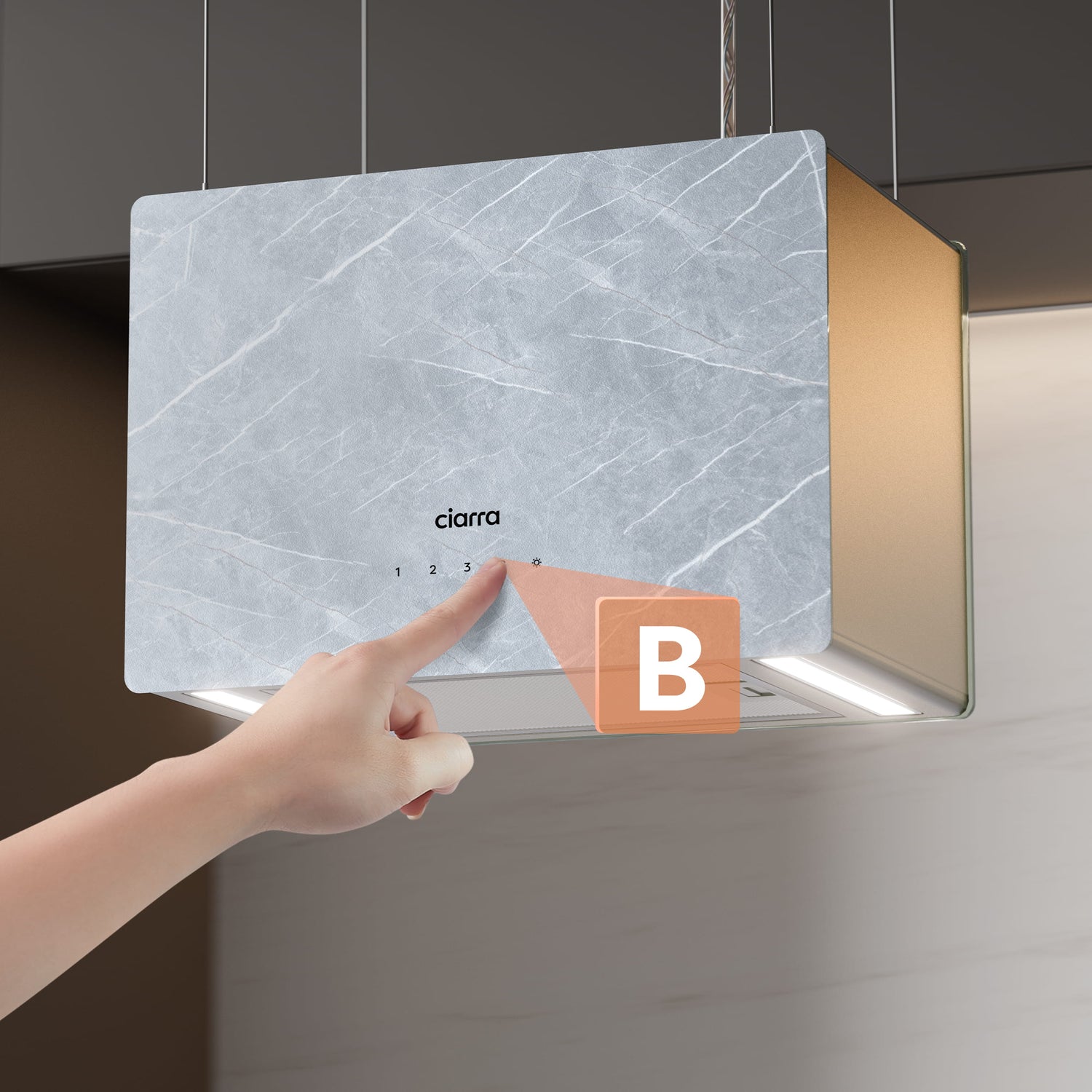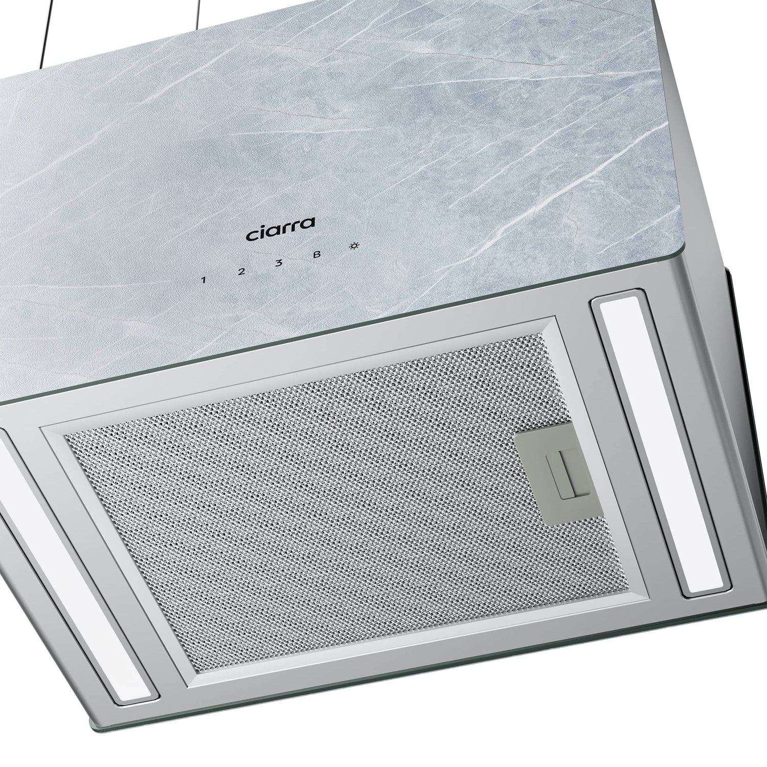 Ciarra Pinnacle 48cm Cappa da Cucina a Isola Smart in vetro marmo Ivory Mist A+++ CBCW4850-OW
