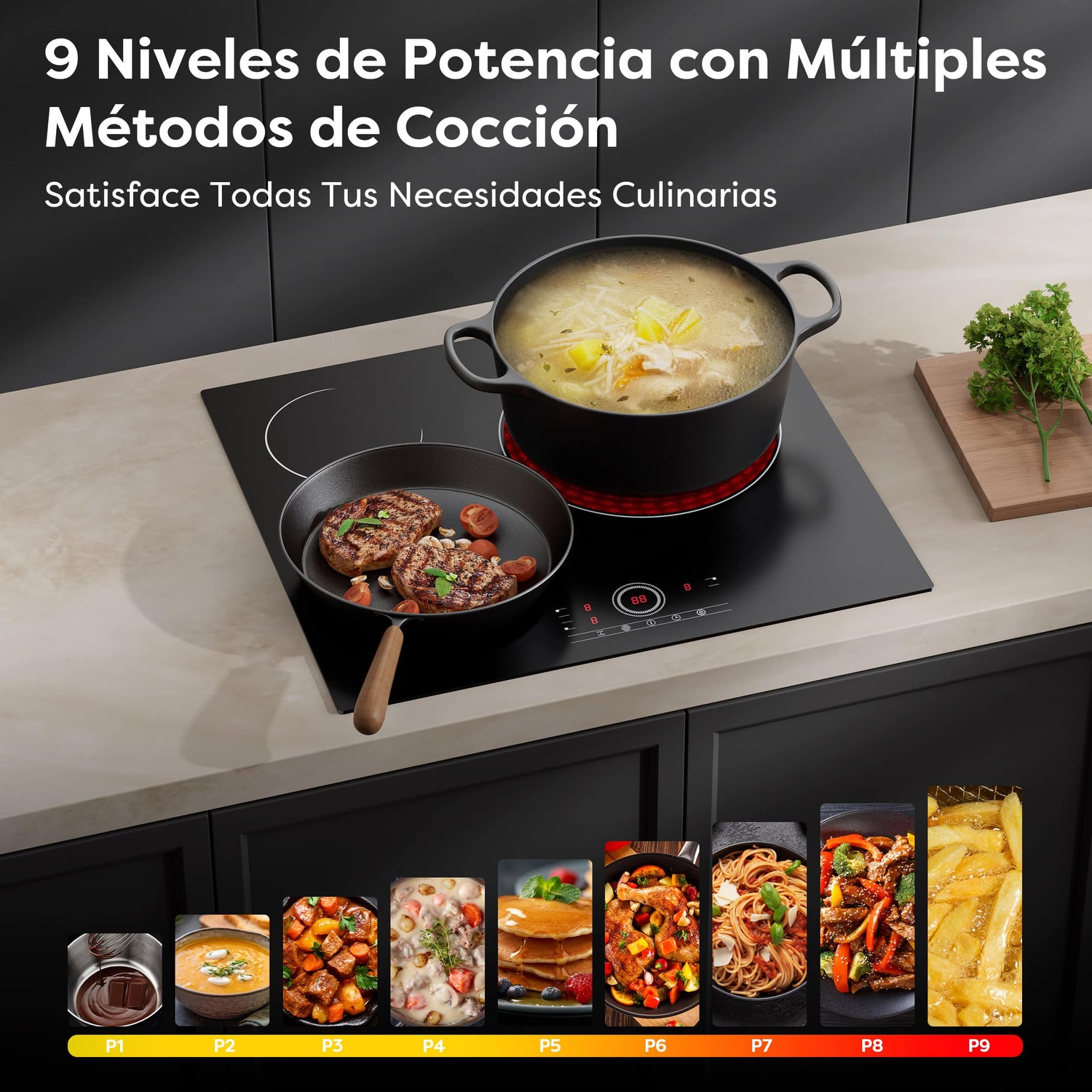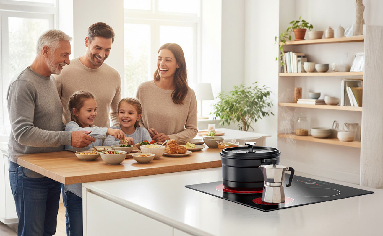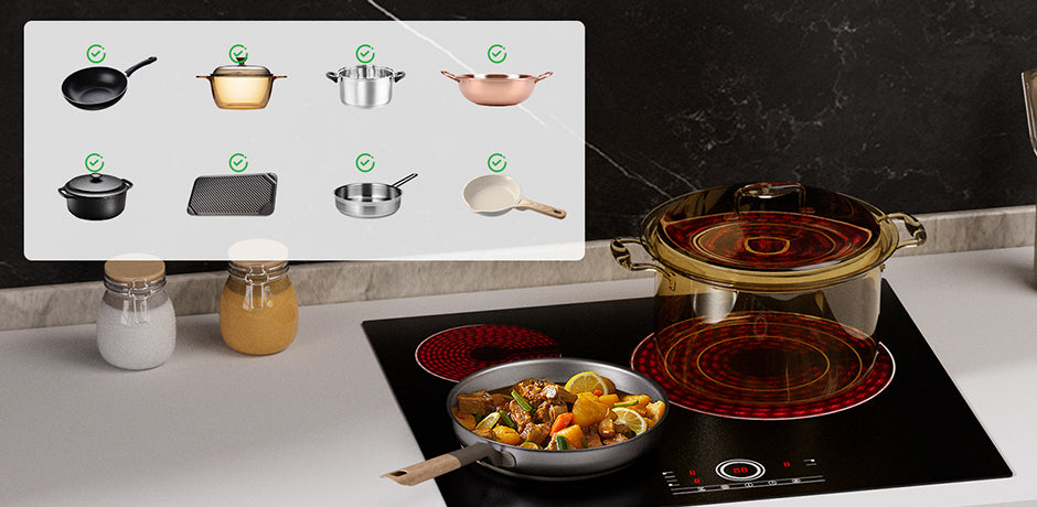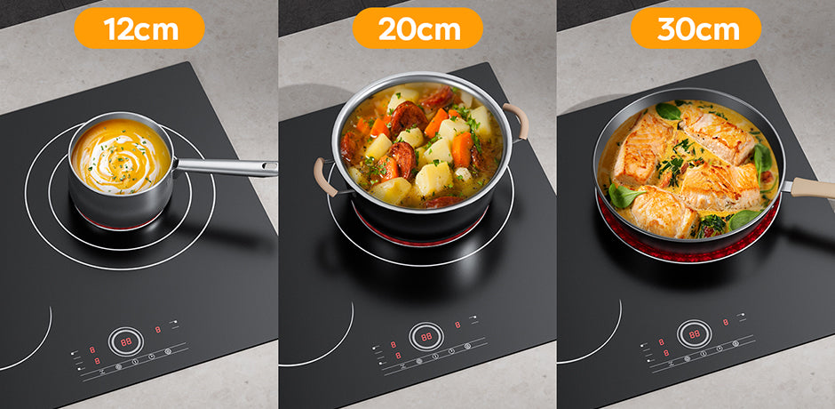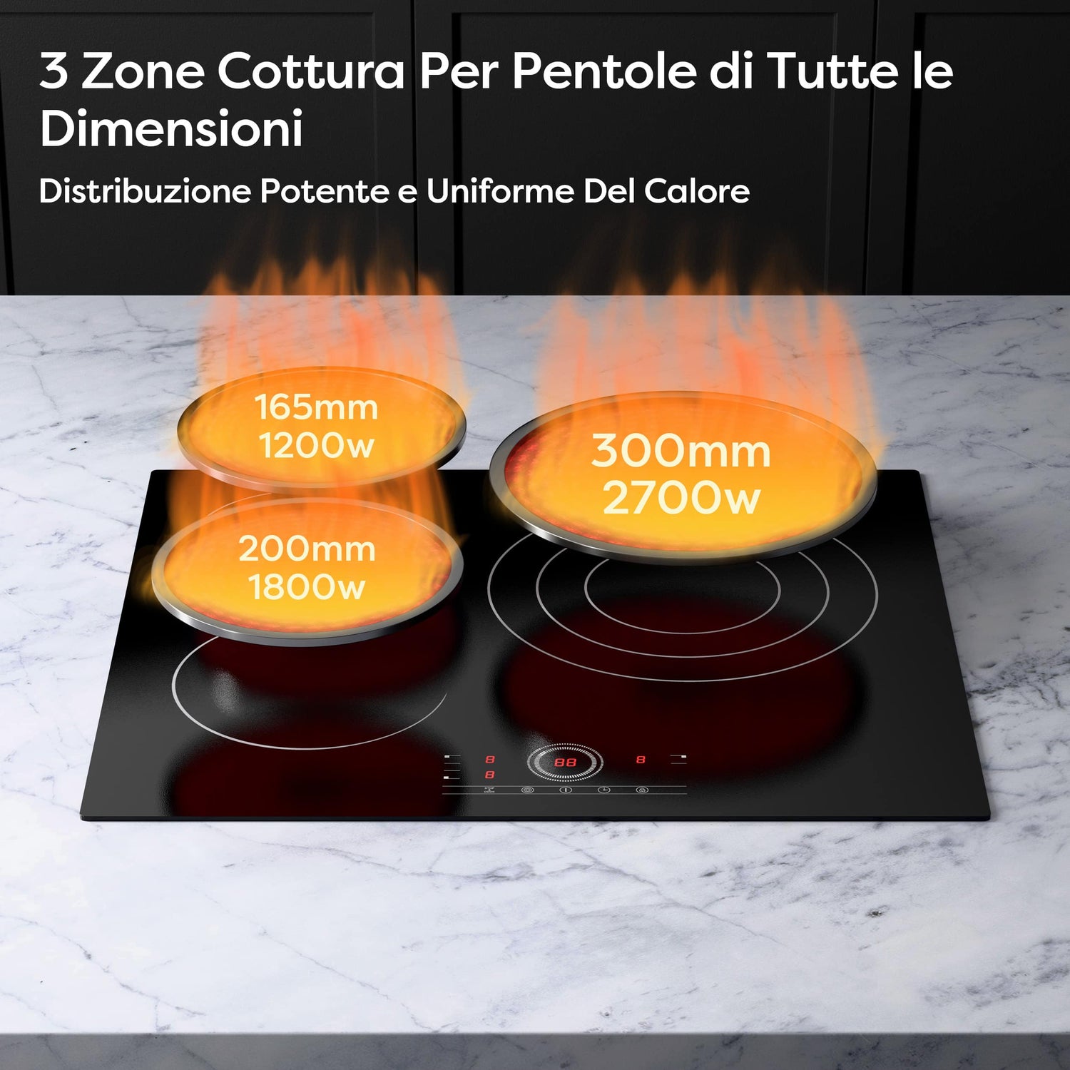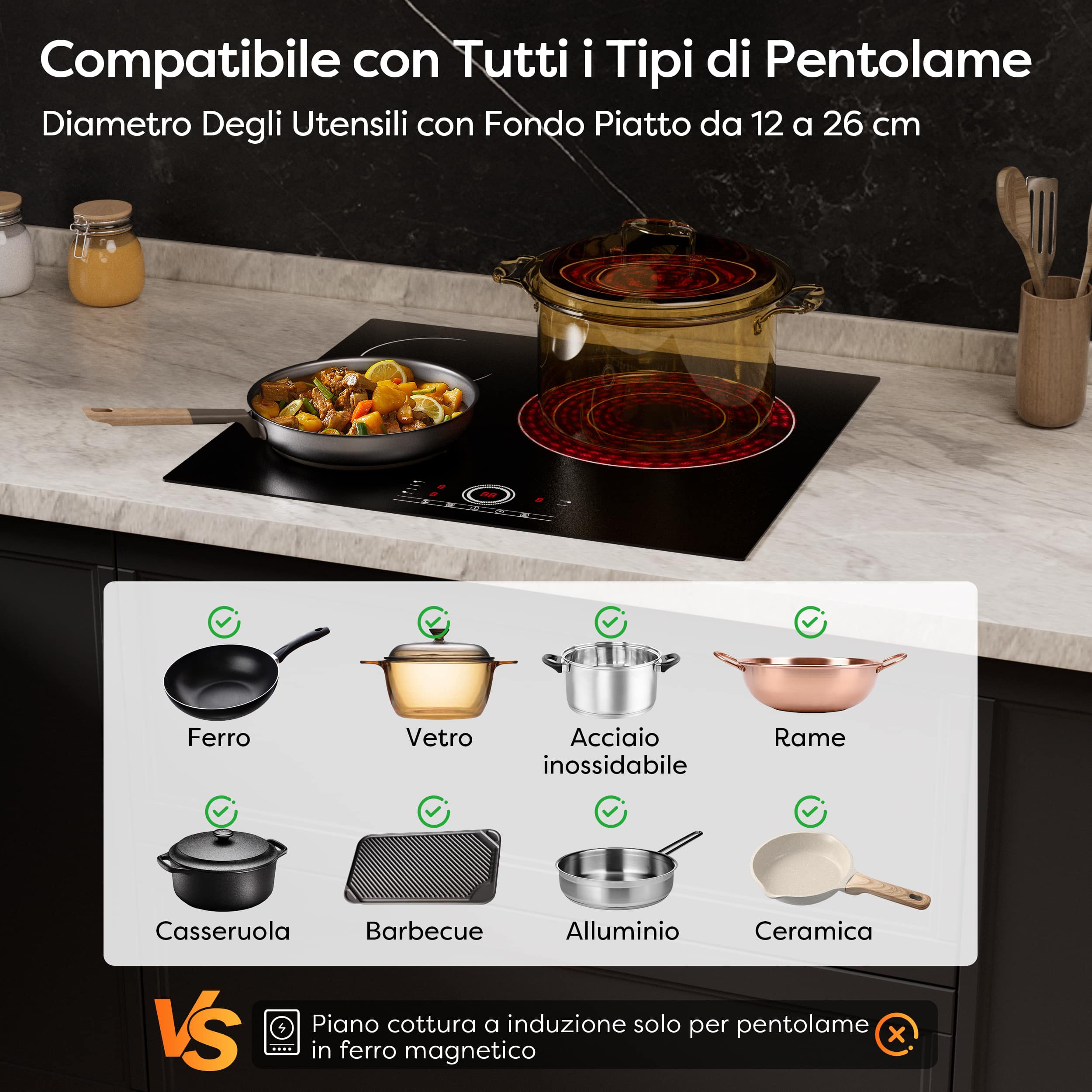 | Riferimento Dimensioni Pentole | Zona 200mm: 140–260mm Zona 165mm: 120–200mm Zona 300mm: 180–300mm |