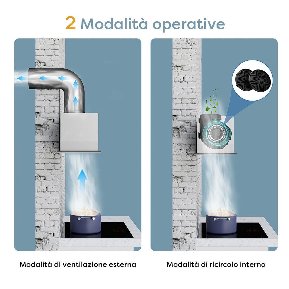 - Modalità ricircolo o scarico – Filtro a carbone incluso