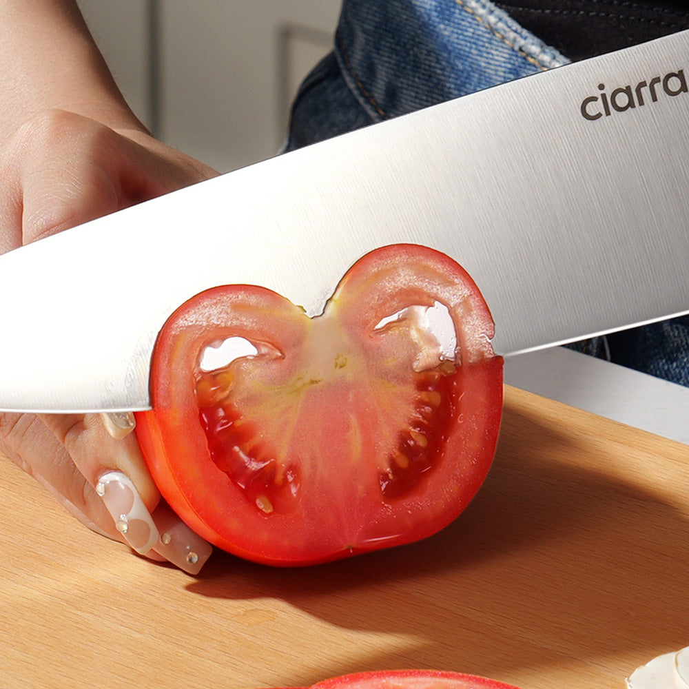 • 🔪AFFIDABILE E DUREVOLE: Ogni lama vanta un'elevata durezza di 55±2 HRC, offrendo un'eccellente tenacità e tenuta del filo. Trattati termicamente e lucidati a mano con un angolo di 13-18 gradi su ogni lato, questi coltelli offrono un taglio di precisione che mantiene l'integrità dei tuoi ingredienti, assicurando i migliori risultati in cucina.