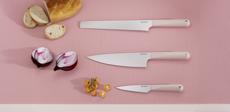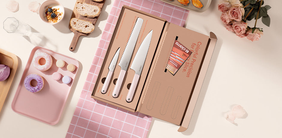 Ciarra Beyond Trio Knife Set con scatola regalo, con coltello da chef, coltello da pane seghettato e coltello multiuso, acciaio inossidabile ad alto tenore di carbonio con impugnatura ergonomica | Sakura Candy