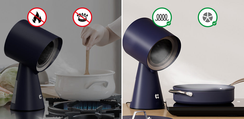 - ⚠️Attenzione⚠️: Si consiglia di utilizzare HOOD TO GO con apparecchi di cottura come piani ad induzione, griglie elettriche, piani cottura elettrici, ecc., e non può essere utilizzato per la cottura a fuoco aperto. L'ingresso d'aria deve essere il più vicino possibile alla superficie di cottura degli altri apparecchi (non più di 10 cm di distanza) per migliorare l'efficienza del tasso di estrazione.